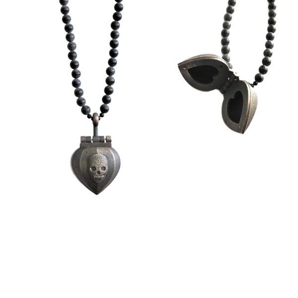 Blackened 3d printed bronze steel + black stone beads. Locket opens to reveal a cavity inside. Magnet catch.